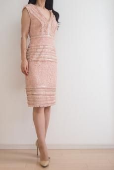 【SALE】108,000→80,000→ →→→60,000円(税抜)!! フレアーワンピースで可憐な一枚 着用しやすいVネックデザイン フラワーが一面に咲くパールピンク