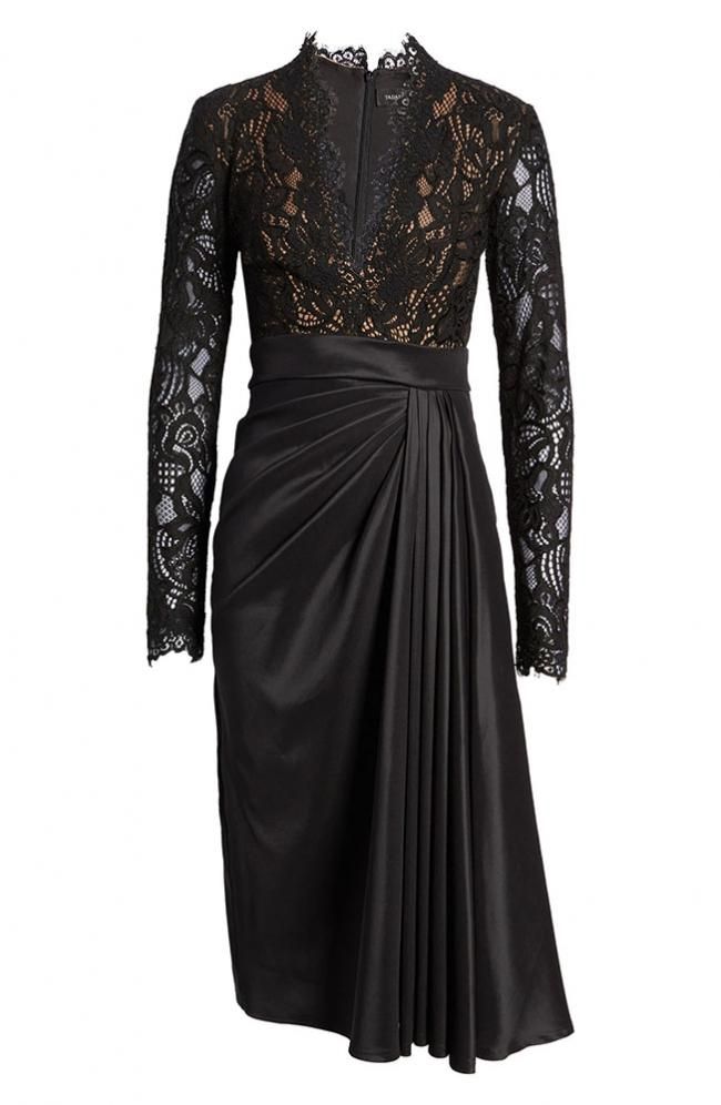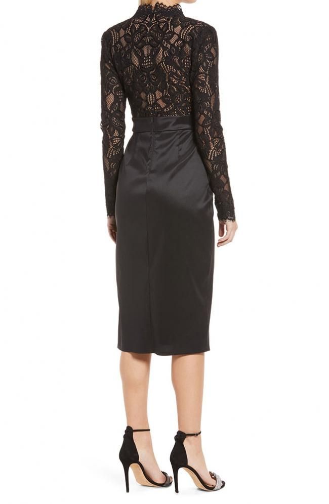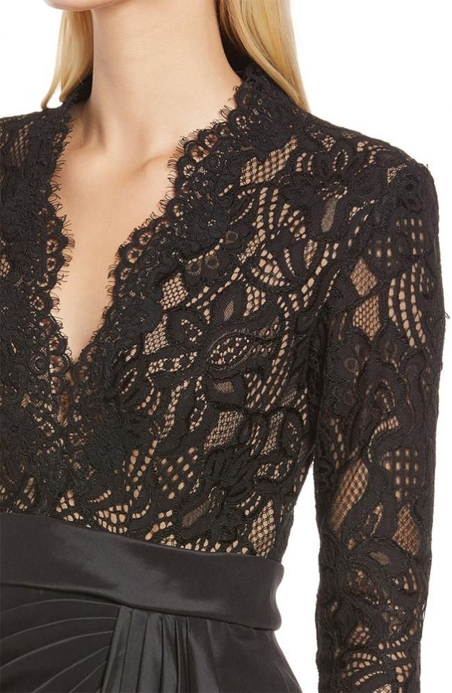 US8【SALE】シースルーアーム長袖 Vネック レース タフタ ミディドレス 黒 Black/Nude