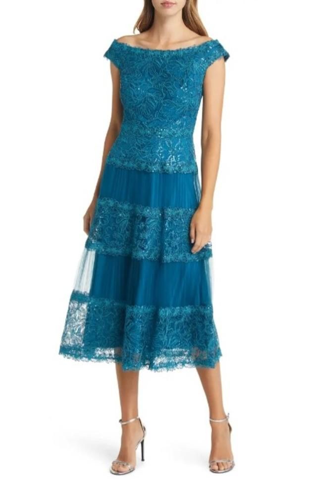 US2【SALE】スパンコールレース刺繍 エンブロイダリー バトーネック ミディドレス 青 ブルー Atlantic Blue