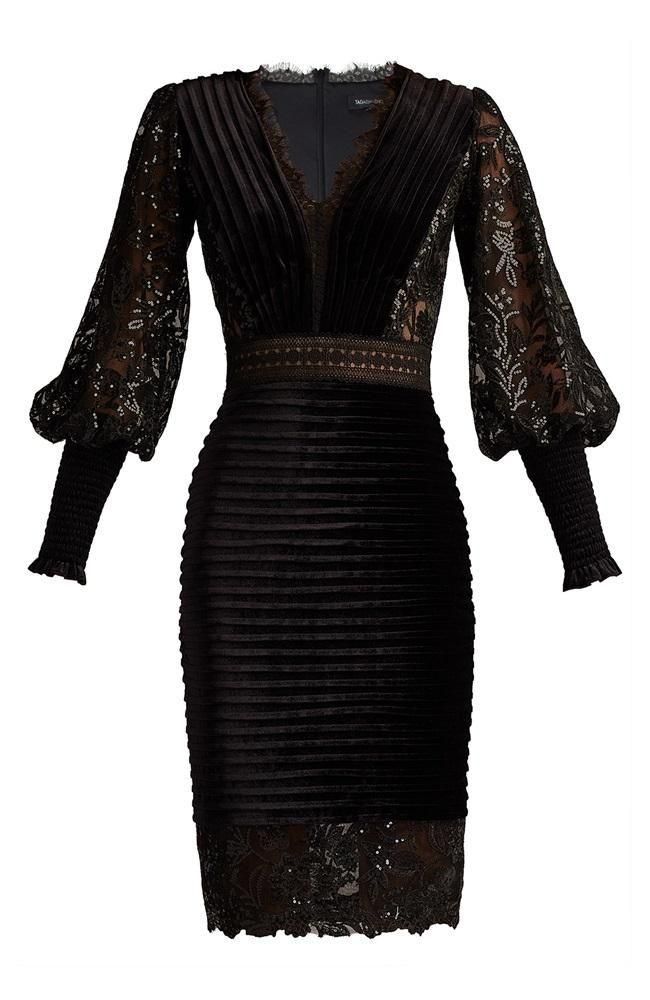 【SALE】長袖 リブ ピンタックVネック ベルベット レースドレス ブラック 黒 Black